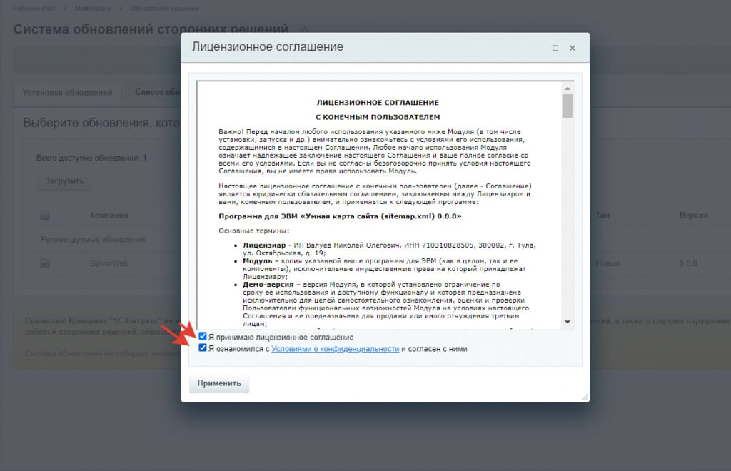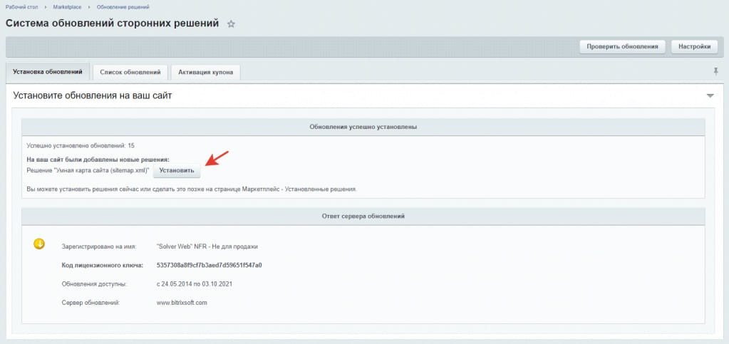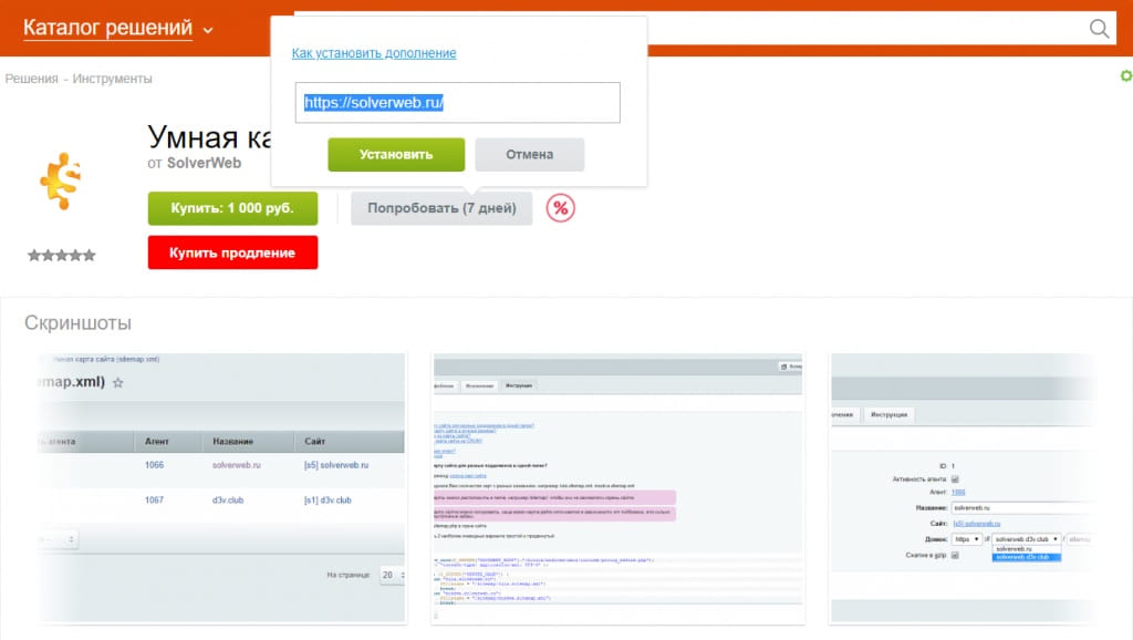 1. Зайдите по ссылке https://marketplace.1c-bitrix.ru/solutions/solverweb.sitemap/, нажмите кнопку «Попробовать».