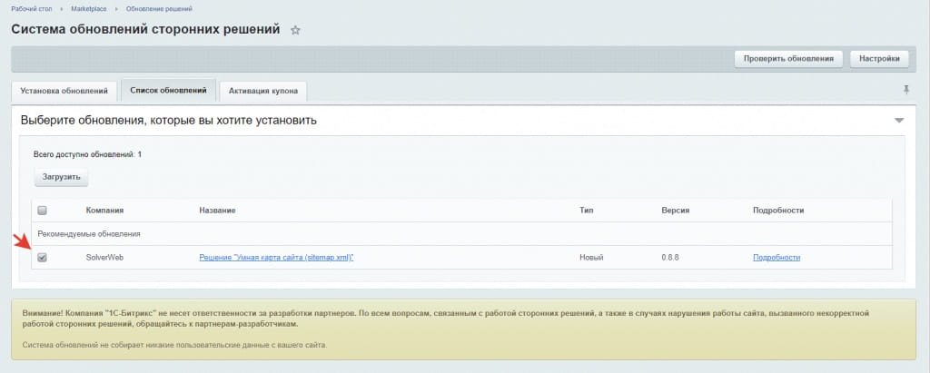 3. Откроется страница загрузки модуля на сайт. Проверьте, что напротив модуля стоит галочка, и нажмите кнопку «Загрузить». Так же убедитесь, что напротив других модулей не стоит галочек. Вы должны точно понимать, что делаете, так как при обновлении других модулей может быть нарушена работоспособность сайта.